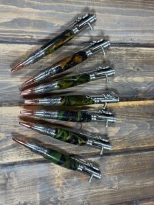 A favorite collaboration is turning the clothing of loved ones lost into custom pens that provide a sentimental and usable piece of art. These projects turn beloved mementos into an object that can be used. It brings new life to something that lost its original purpose. “I’m a sucker for sentimental value. I have branched out to include things like fabric from shirts of loved ones to make unique pieces that can be used and treasured.”